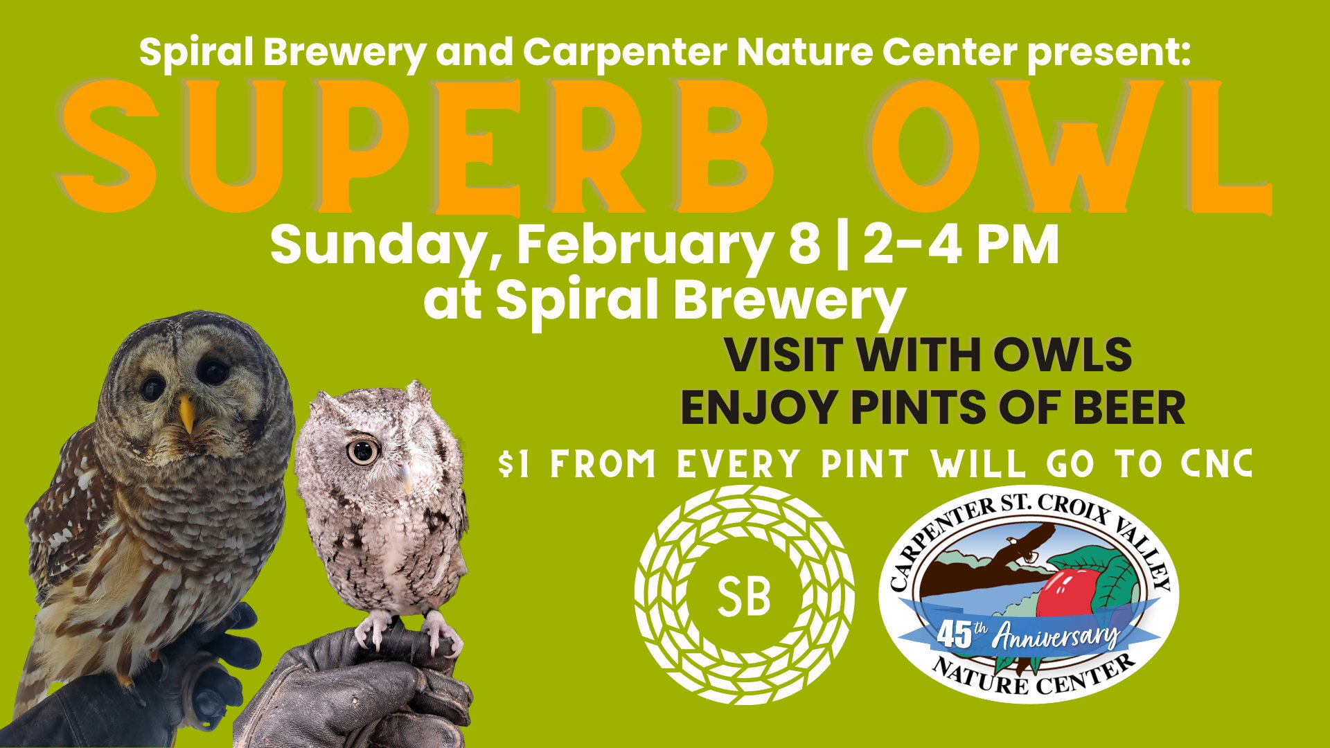 From 2-4 PM Carpenter Nature Center will be in our taproom showing off two of their fabulous owls! $1 from every PINT purchased will go to their incredible work.