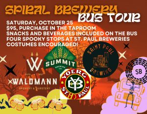 Stop into Spiral Brewery tonight to sign up for our bus tour on Saturday, October 25!! This tour will focus on Saint Paul Breweries and the history of saloons and taprooms in our Capital City! We will stop at: 1. Summit Brewing Company 2. Waldmann Brewery 3. Yoerg Brewery 4. Saint Paul Brewing Your ticket includes: snacks and bevvies on the bus, a beer at Spiral Brewery, history lessons and facts about brewing and saloons in St. Paul, TWO beers…